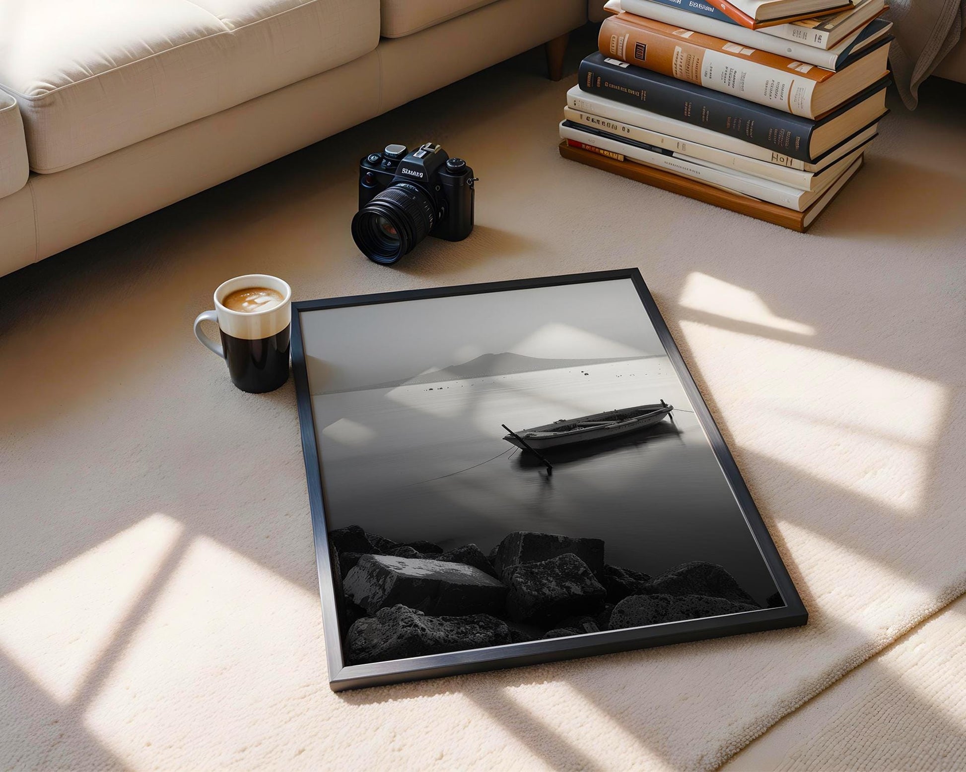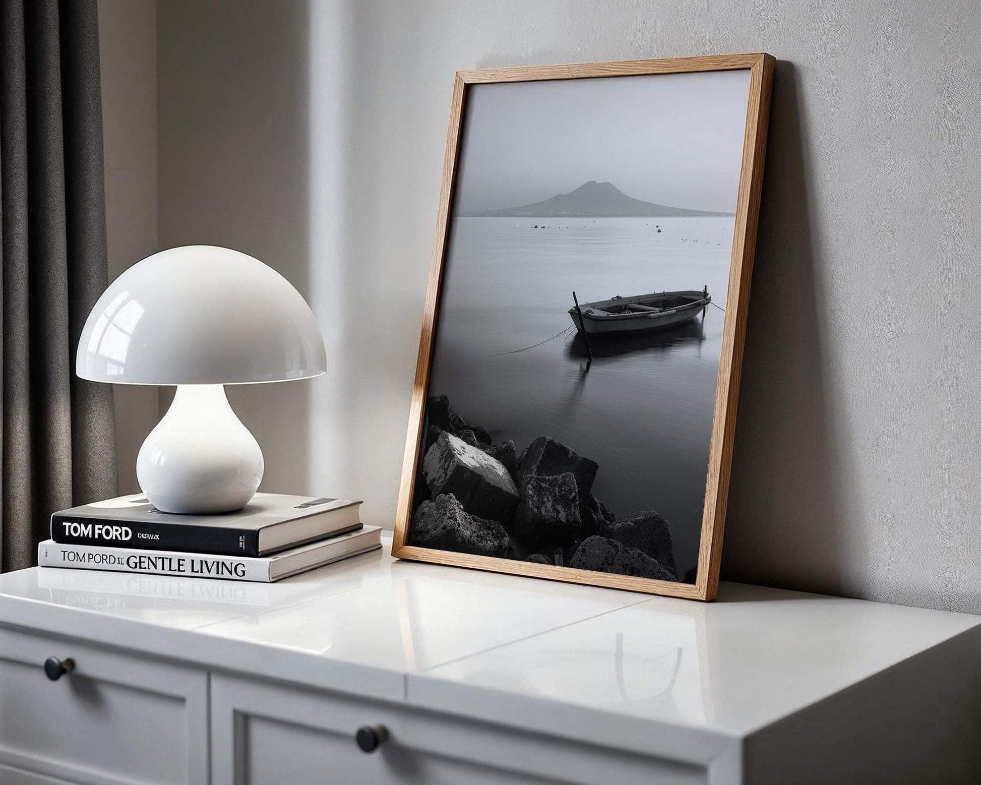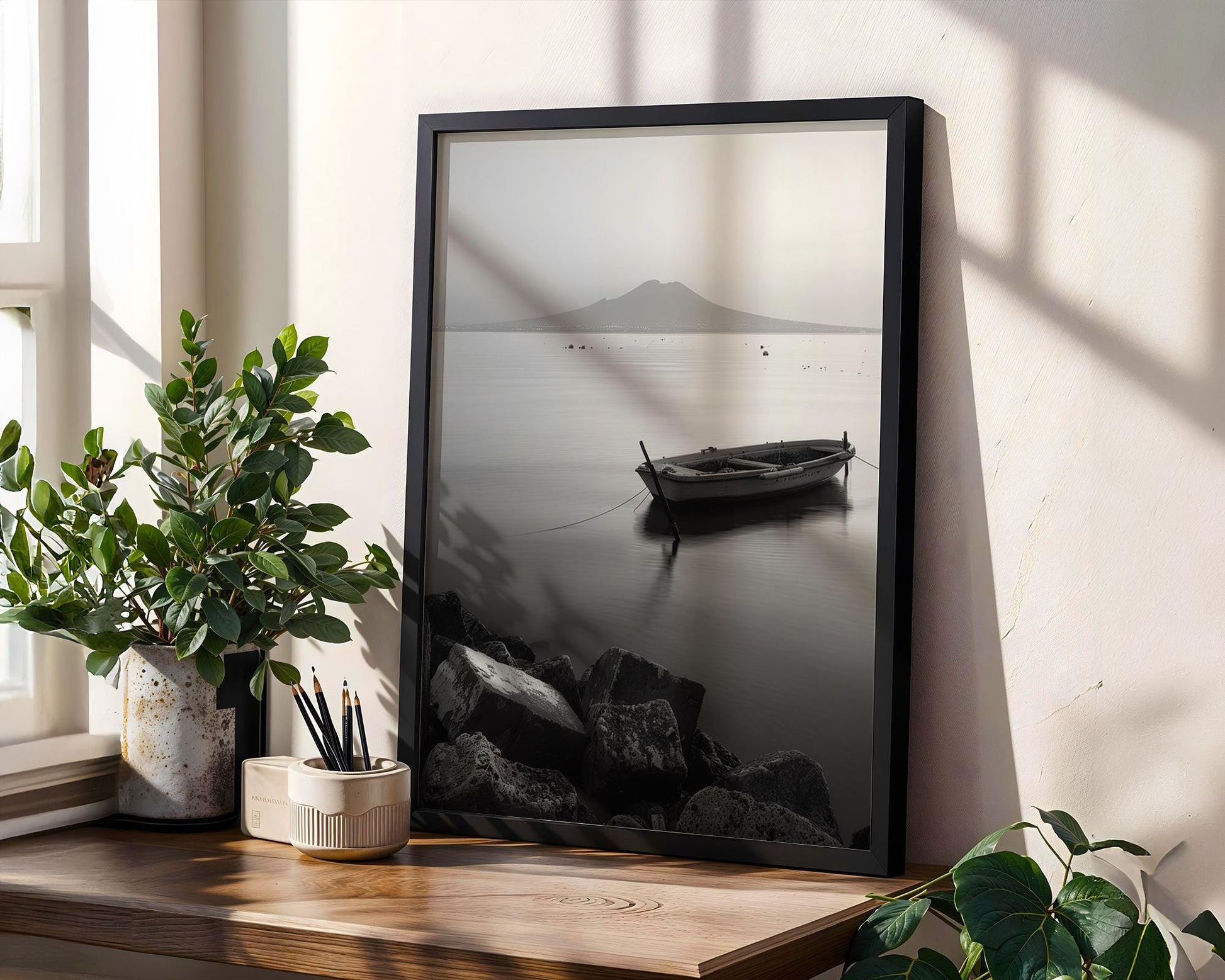 World Landmark | Naples Italy Photography | Mount Vesuvius, Boat Black and White Print